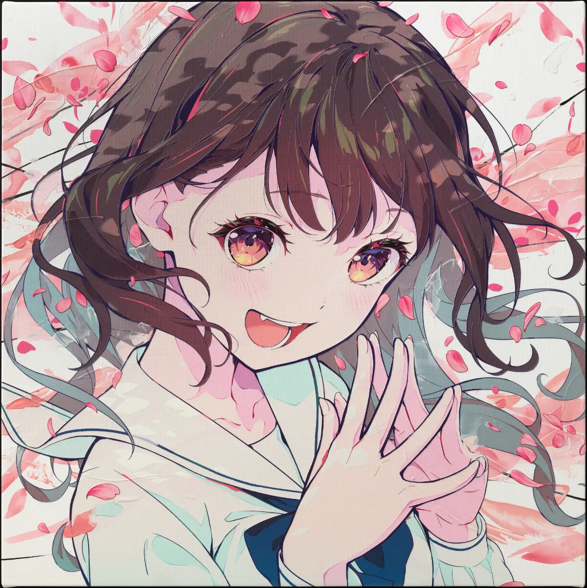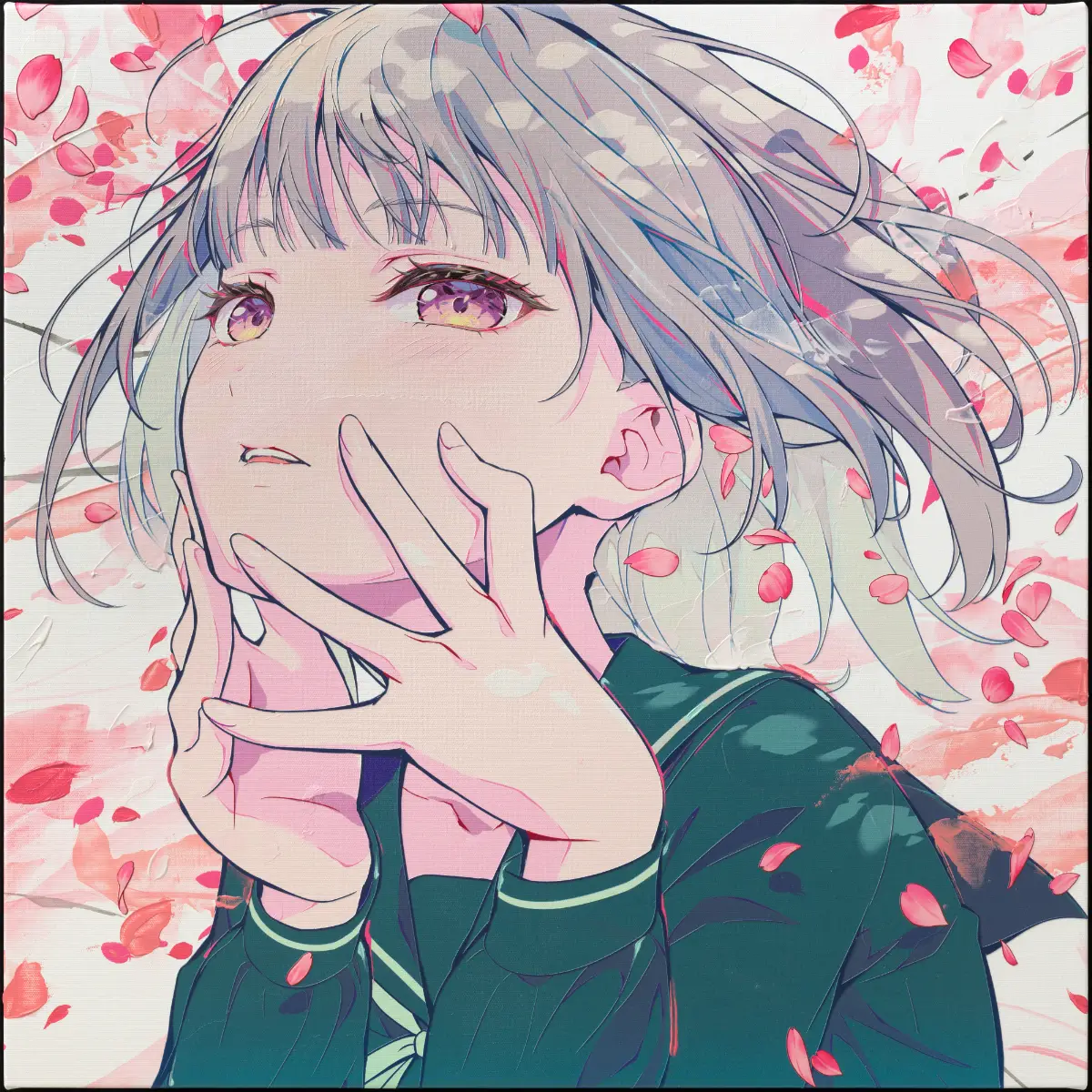 桜をテーマに、「卒業」をイメージしています。UVプリントと、アクリル絵具での工程を組み合わせて制作しています。